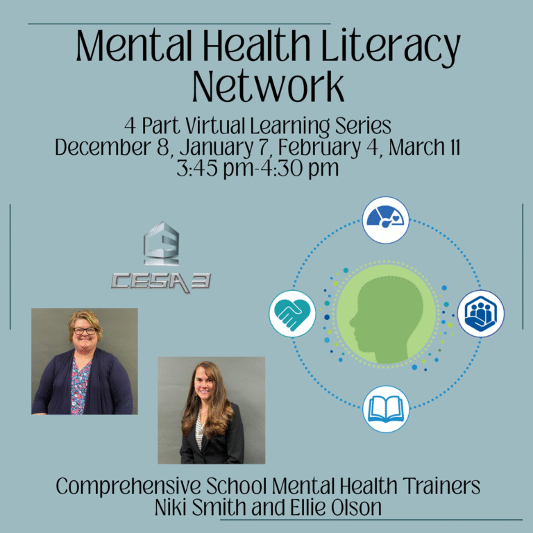Join the Mental Health Literacy Network, a four-part virtual professional learning series designed to build knowledge, confidence, and practical strategies for supporting student mental wellness. Each 45-minute session explores a key component of mental health literacy to strengthen school-wide understanding and support. This event is open to ALL Staff at CESA 3 Schools!